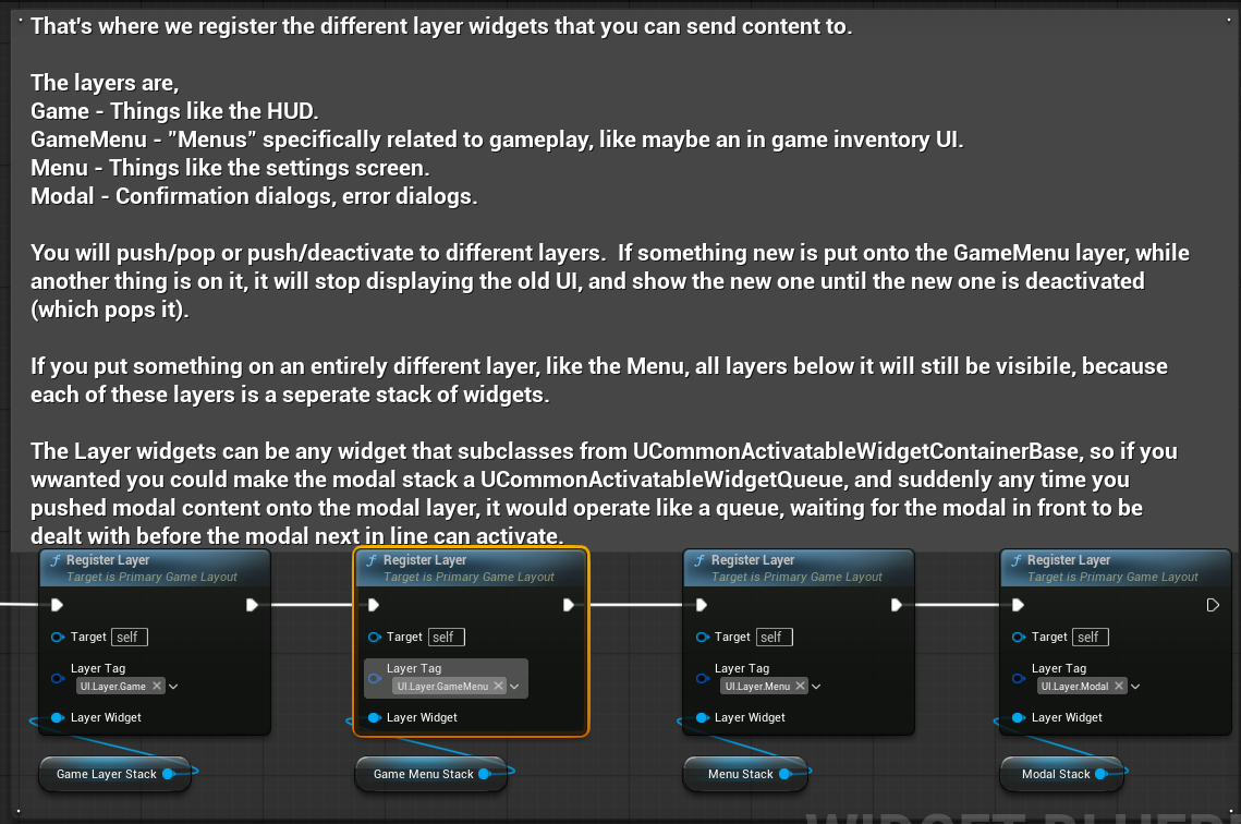 PrimaryGameLayout负责Layer的注册,以及Widget到Layer的push和remove。此外还有布尔类型的值bIsDormant和相关函数,用于给GameUIPolicy判断本地玩家的RootLayout是否显示在屏幕上。