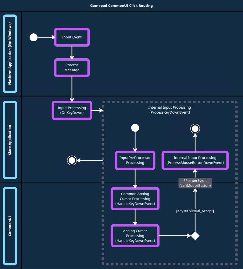 为了让Gamepad操作沿用鼠标的处理逻辑,CommonUI引入了合成光标FCommonAnalogCursor。它可以通过摇杆/Dpad导航到一个可交互的UI控件上,然后通过点击“EKeys::Virtual_Accept”按键来模拟鼠标左键点击UI