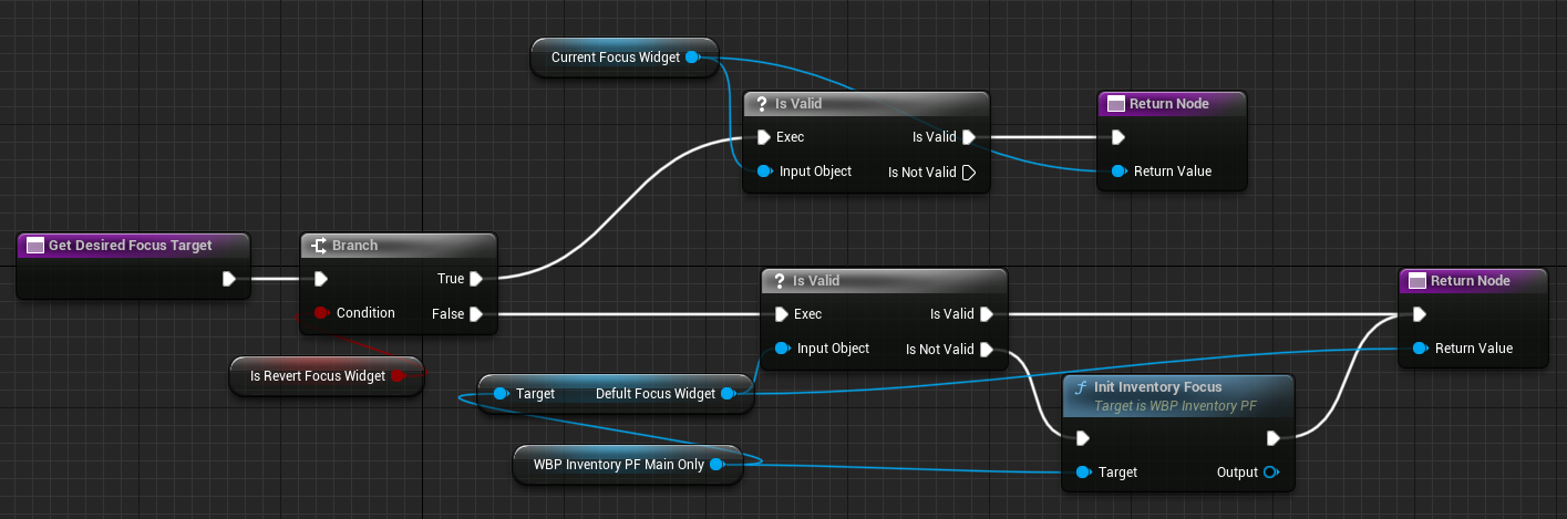 - 必须实现GetDesiredFocusTarget方法,用于激活面板时聚焦那个Widget。当CommonActivatableWidget(及其子类对象)成为主激活控件时,可以在蓝图中通过重写这个函数来设置默认聚焦的控件对象。